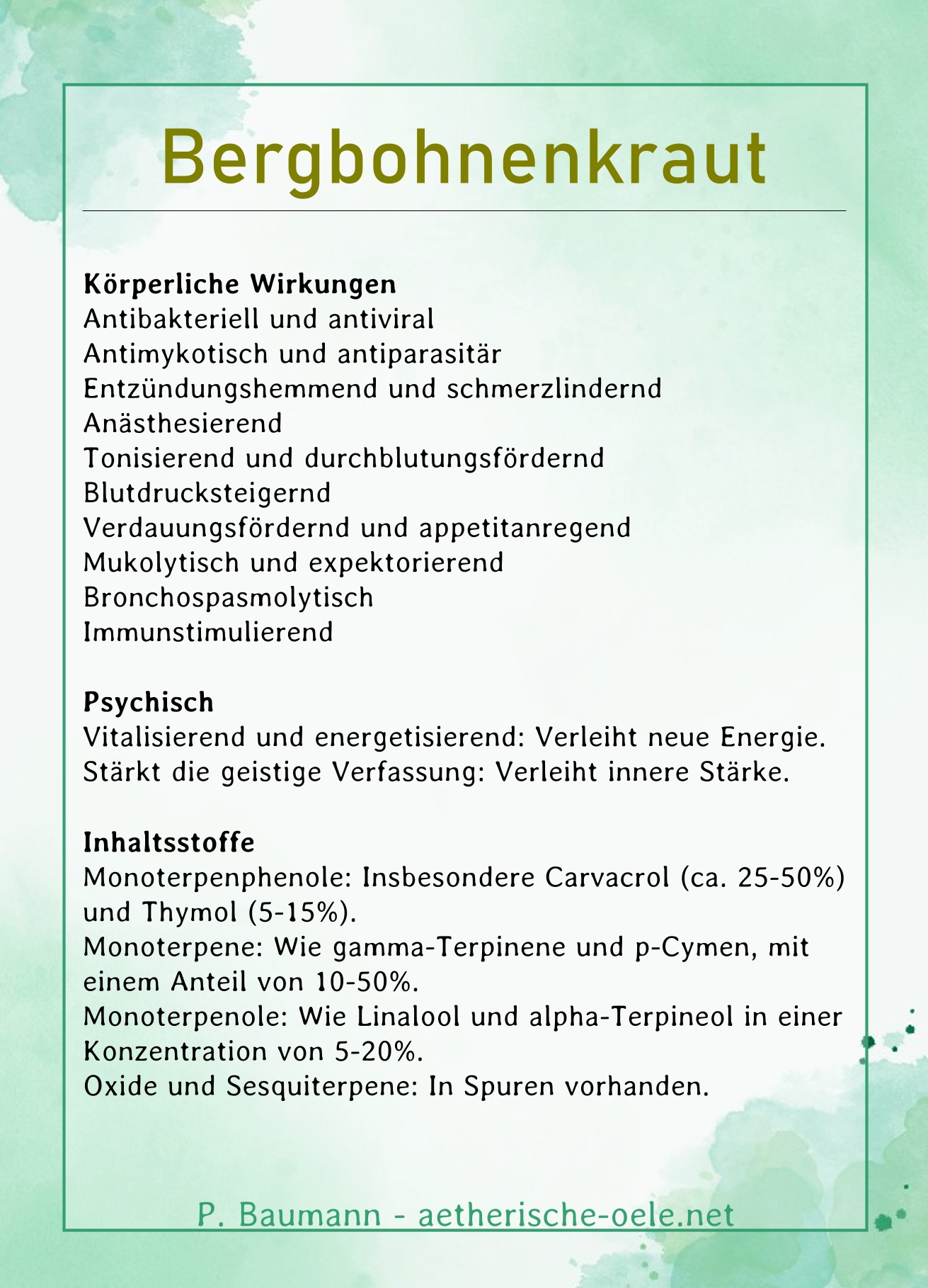 Das ätherische Öl vom Bohnenkraut hat bei seiner Wirkung folgende Eigenschaften:
