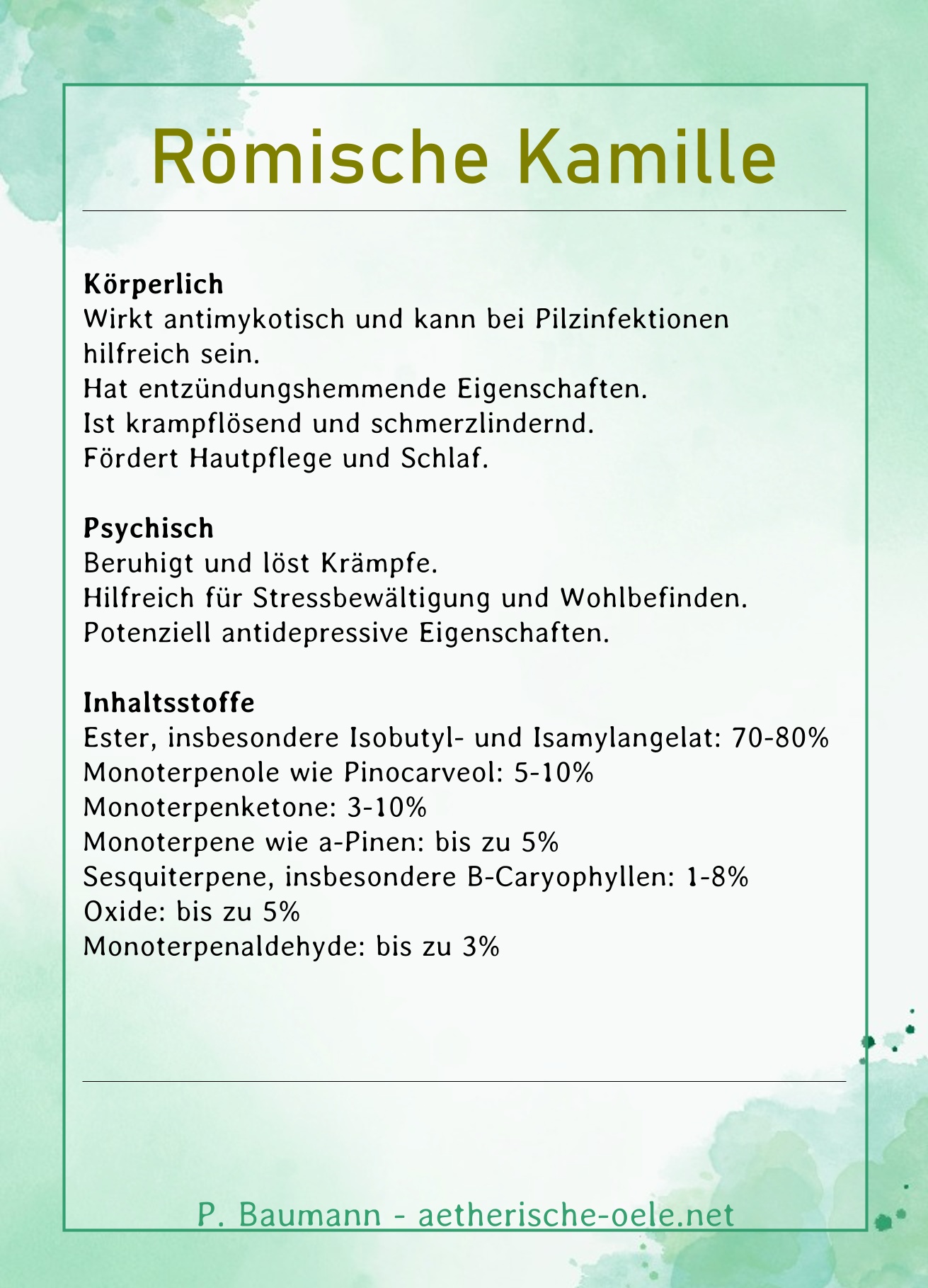 Die Hauptbestandteile des ätherischen Kamille römisch Öls sind vor allem Ester, insbesondere Isobutyl- und Isamylangelat, die 70-80% der Zusammensetzung ausmachen. Weiterhin sind Monoterpenole wie Pinocarveol mit einem Anteil von 5-10% vertreten, ebenso wie Monoterpenketone in einer Konzentration von 3-10%. Monoterpene wie a-Pinen tragen bis zu 5% zur Gesamtzusammensetzung bei, während Sesquiterpene, insbesondere B-Caryophyllen, 1-8% ausmachen. Oxide sind in einer Konzentration von bis zu 5% vorhanden, und Monoterpenaldehyde sind bis zu 3% vertreten.